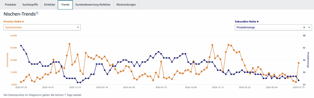 Die Daten werden wöchentlich aktualisiert und basieren auf echtem Amazon-Such- und Kaufverhalten – keine externen Hochrechnungen, sondern 1st-Party-Daten direkt aus dem Amazon-Ökosystem.
